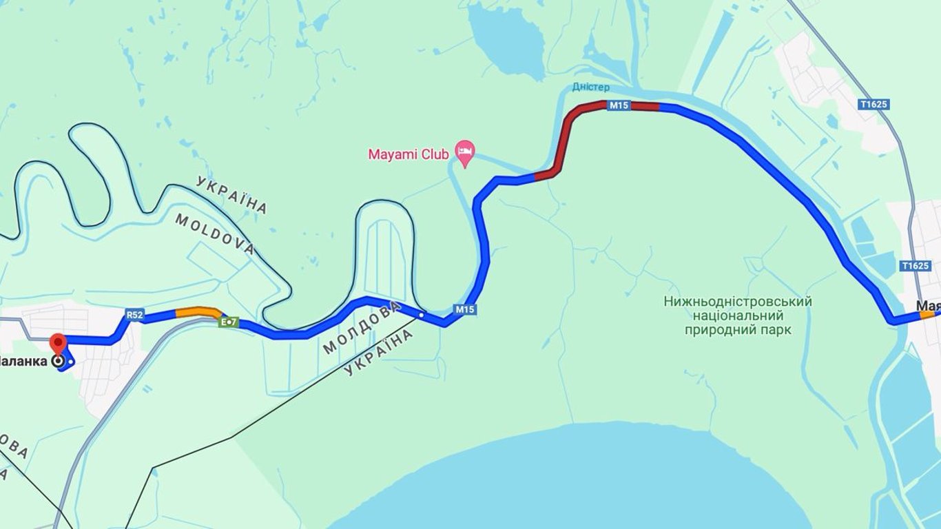 Наразі у бік пункту пропуску "Паланка — Маяки — Удобне" є великий затор у районі природного парку та обох пропускних пунктів. Ця ділянка на картах позначена червоним та жовтим кольором. Подорож до Паланки триватиме сьогодні 1 годину 26 хвилин.