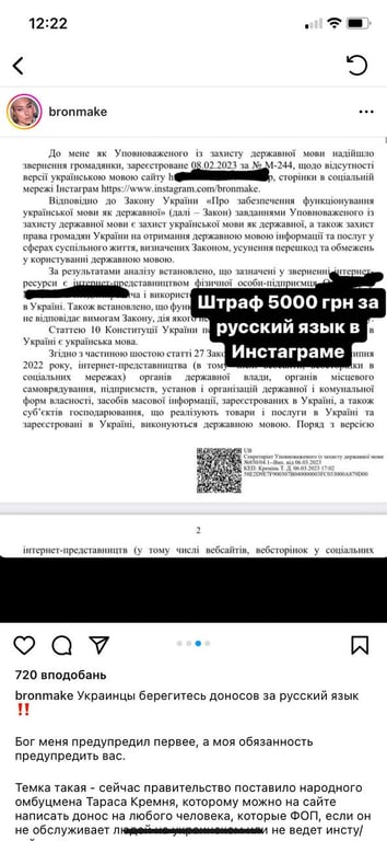 Блогерка займається підприємницькою діяльністю та рекламує свої послуги на своїй сторінці в Instagram та на сайті, де використовує російську мову для звернення до клієнтів. Проте, така діяльність є незаконною в Україні, тож дівчину оштрафували у розмірі на суму в 5 тисяч гривень.