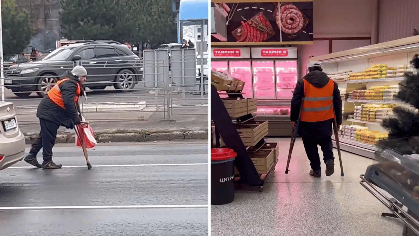 На кадрах можна помітити, чоловіка з, на перший погляд, обмеженими можливостями, який просить милість. Він опирається на милиці та тяжко йде між машинами, поки ті стоять на світлофорі. Згодом на відео видно, як цей самий чоловік уже жваво гуляє між полиць супермаркету. Варто додати, що в магазині він уже не опирається на милиці, а просто їх несе.
