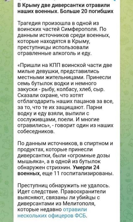 РосЗМІ пишуть, що у горілці та їжі, яку принесли дівчата, був миш’як. В результаті 24 окупанти вмерли, а ще 11 госпіталізовано. Наразі відомо, що дівчат не знайшли. У росіян триває слідство.