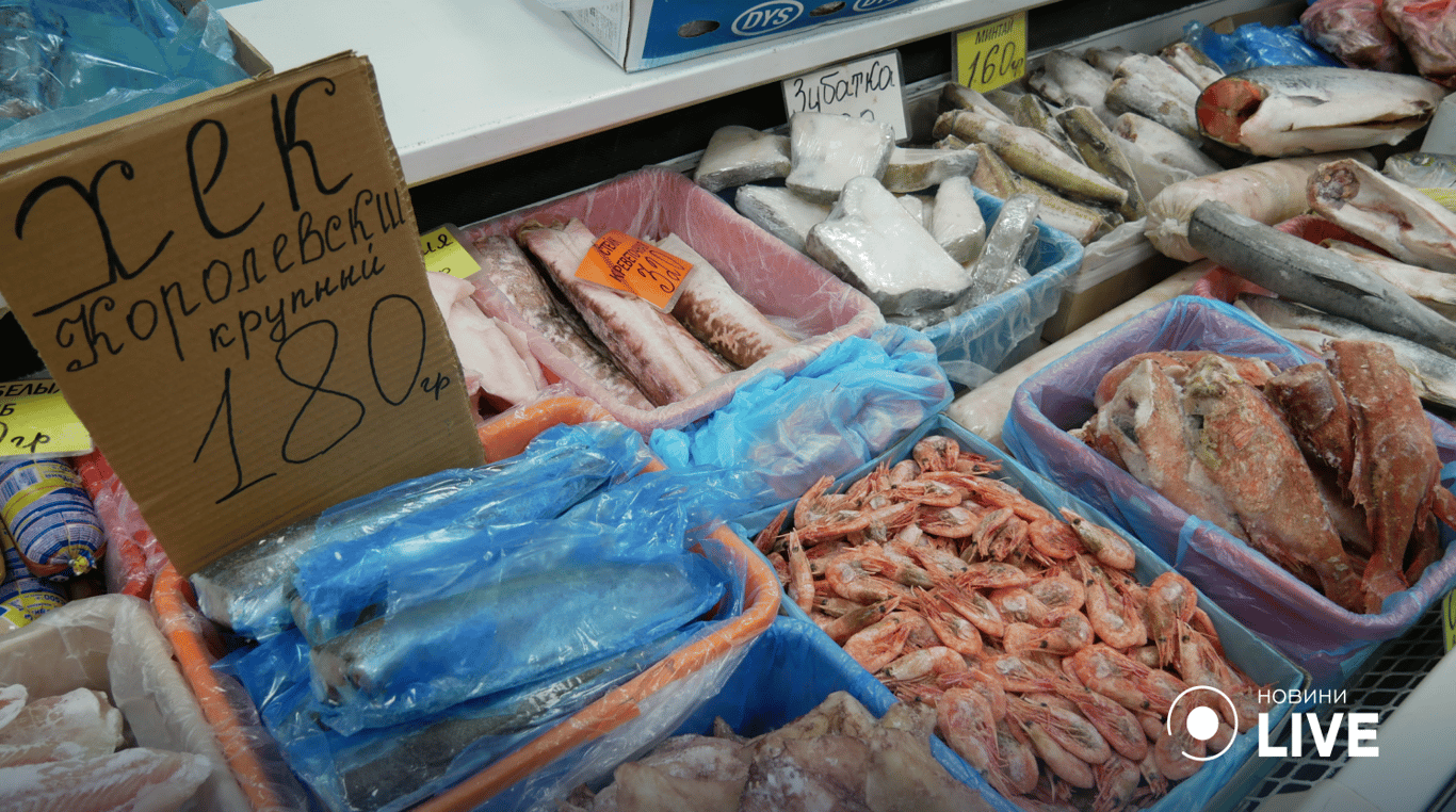 Свіжої риби на ринку "Київський", як і на інших базарах міста, наразі немає. Пов’язано це із забороною на вилов та продаж річкової та морської риби із невстановлених місць. Таку заборону ввели після теракту на Каховській ГЕС, в результаті чого у Чорному морі та пов’язаних із ним водоймах почався масовий мор живих біоресурсів. Попри це, на ринку можна придбати заморожену, охолоджену, копчену та в’ялену рибу.