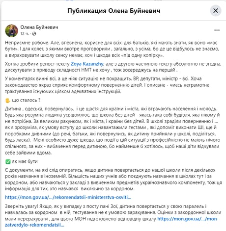 "Тестування ж цілком логічне для того, щоб надолужити втрачене з тих предметів, які дитина не вивчала. Української мови, наприклад. Звісно, батькам і дитині потрібно пояснити, що воно не для зарахування чи оцінки, а для того, щоб вчителі могли індивідуально допомогти у ситуації, коли дитина була позбавлена вивчення цього необхідного предмету", — йдеться у повідомленні Олени Буйневич.