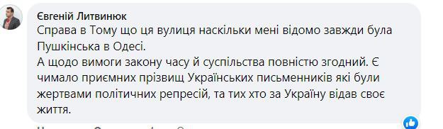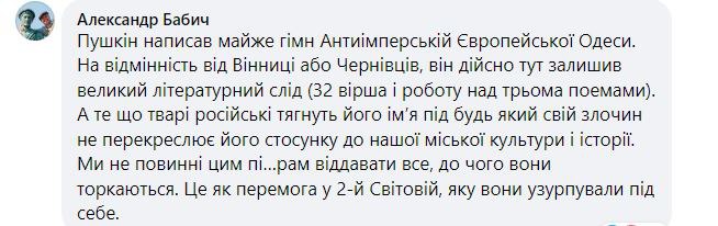 "Пушкін написав майже гімн Антиімперській Європейській Одесі. На відмінну від Вінниці або Чернівців, він дійсно тут залишив великий літературний слід (32 вірші й роботу над трьома поемами). А те, що тварі російські тягнуть його імʼя під будь-який свій злочин, не перекреслює його стосунку до нашої міської культури й історії. Ми не повинні цим пі…рам віддавати все, до чого вони торкаються. Це як перемога у Другій світовій, яку вони узурпували під себе", — написав член історико-топонімічної комісії Одеської міської ради Олександр Бабіч.
