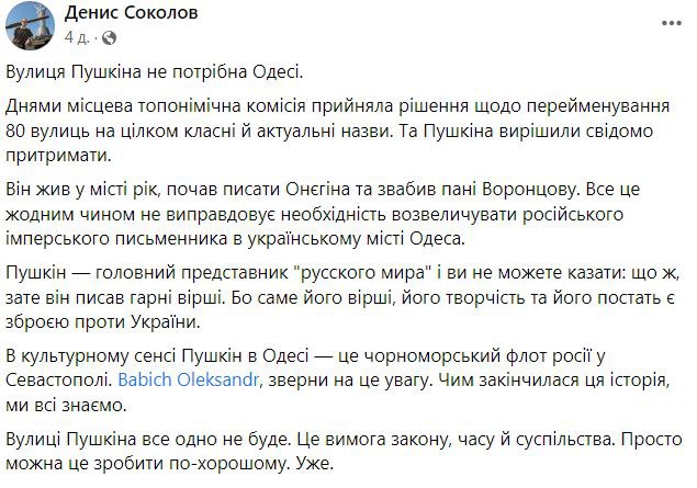 "В культурному сенсі Пушкін в Одесі — це чорноморський флот Росії у Севастополі. Чим закінчилася ця історія, ми всі знаємо. Вулиці Пушкіна все одно не буде. Це вимога закону, часу й суспільства. Просто можна це зробити по-хорошому. Уже", — резюмував Денис Соколов.
