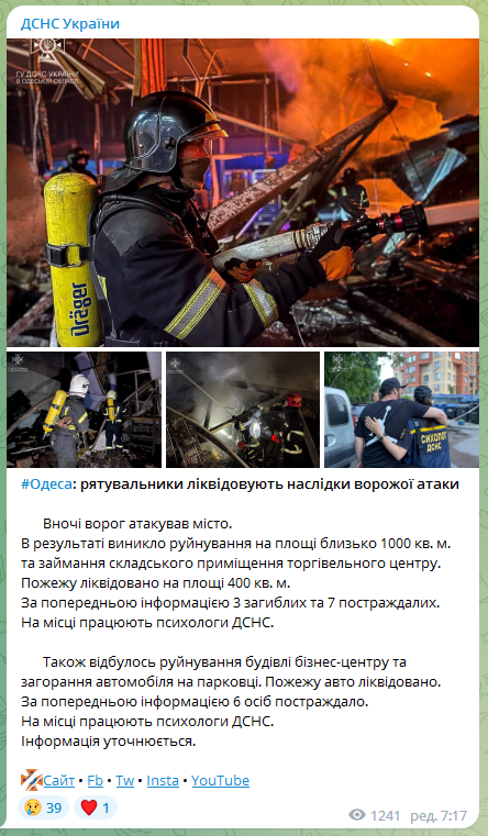 В Одесі внаслідок нічного російського обстрілу загинули три людини і постраждало 13 осіб. Пожежі, які розпочалися після влучань, оперативно ліквідували рятувальні підрозділи ДСНС.