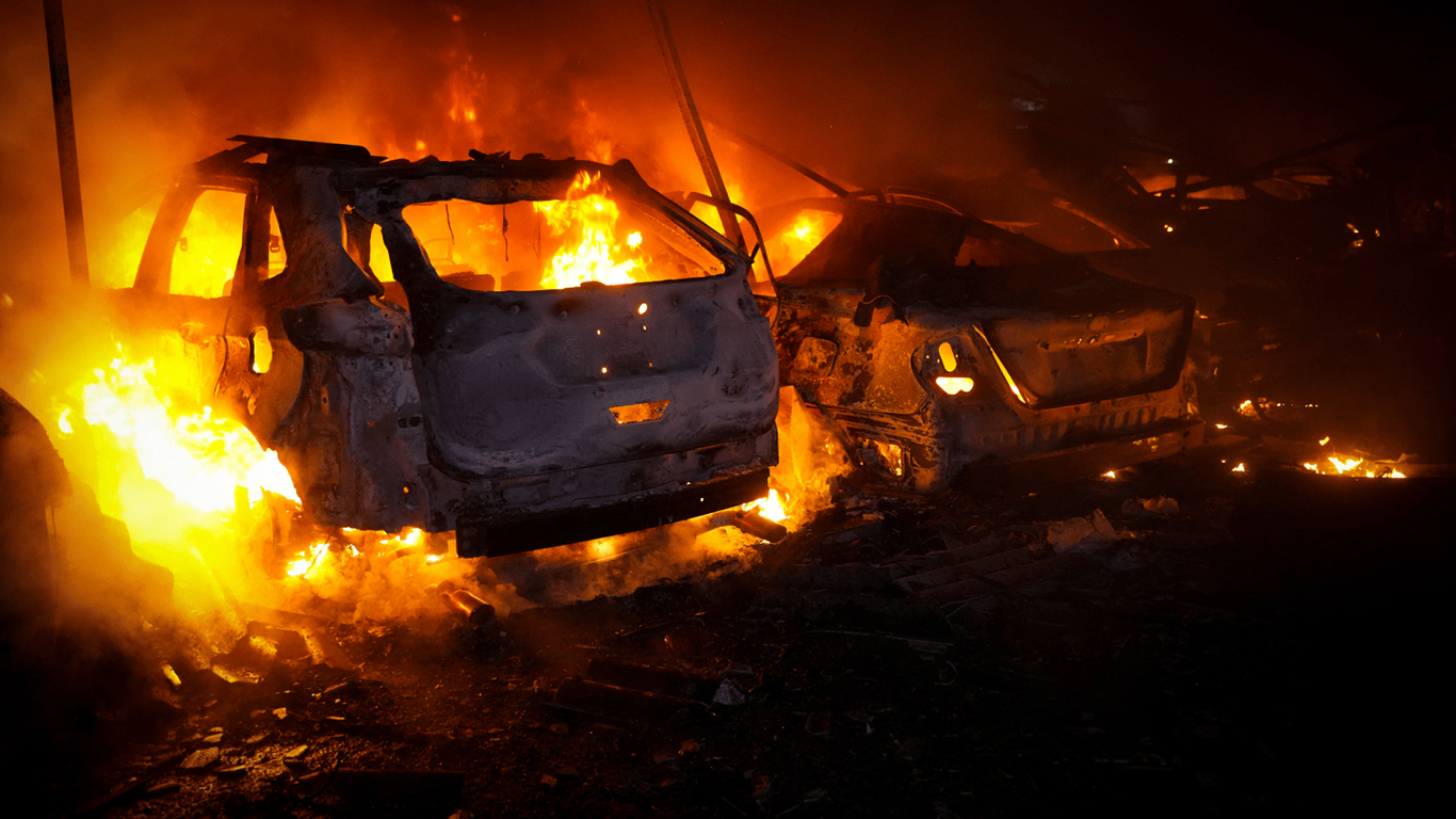 За інформацією рятувальників, один із ворожих ударів прийшовся на автостоянку, розташовану серед багатоповерхових житлових будинків. Полум’я охопило одразу 20 автомобілів.