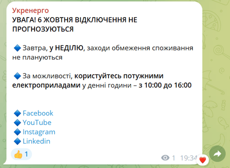 Про це у суботу, 5 жовтня, повідомили у пресслужбі Укренерго.