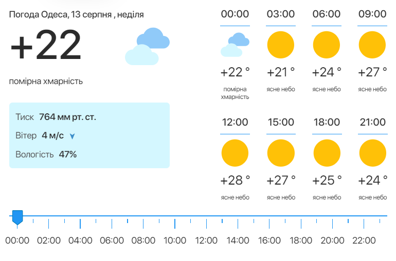 Сьогодні, 13 серпня, в Одесі очікується ясна погода без хмар. Літо йде на спад, тому температура повітря прогріється до +30 градусів.