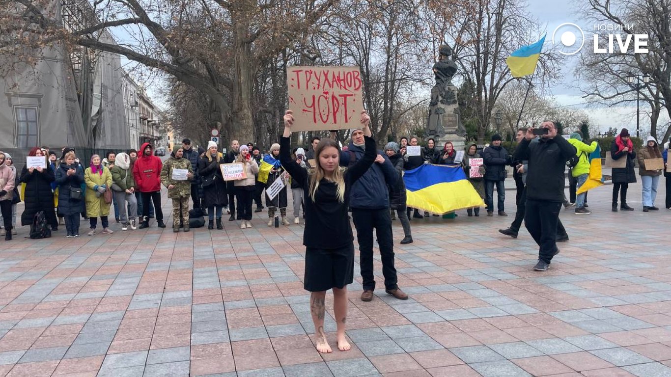 Кілька десятків одеситів зібралися сьогодні на Думській площі, щоб виразити свій протест непершочерговим витратам бюджетних коштів. Вони прийшли з портретами загиблих воїнів та плакатами, на яких написано "Гроші на ЗСУ" та інше. У ході протесту одна з мітингувальниць стояла на площі боса з плакатом, що військові мерзнуть.