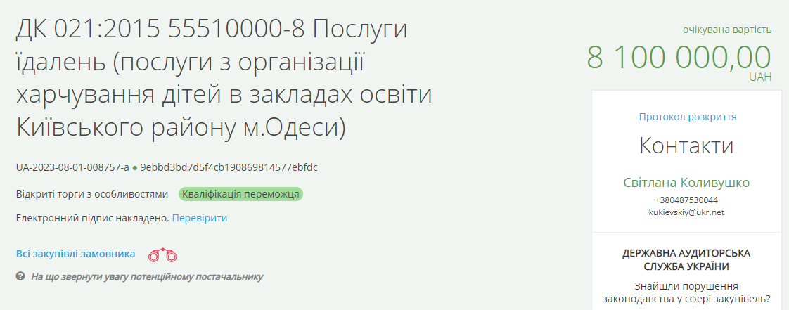 За даними відкритого аукціону, КУ "Центр фінансування та господарської діяльності закладів та установ системи освіти Київського району Одеси" провело тендер у форматі відкритих торгів з особливостями 9 серпня.