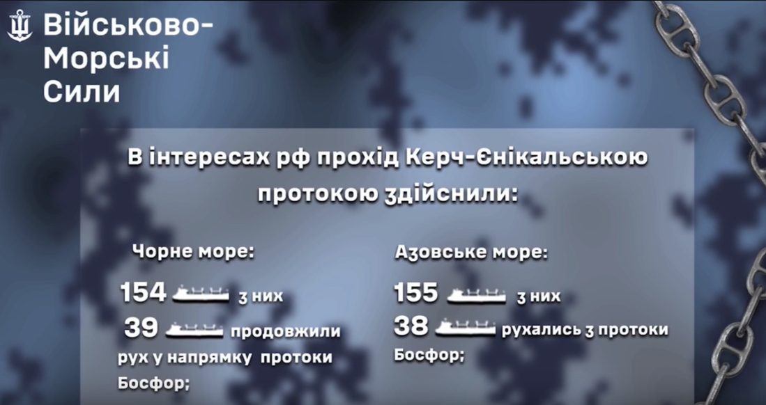 - до Азовського моря — 155 суден, з них 38 суден рухались з протоки Босфор;