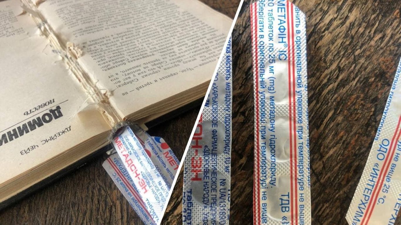 Смужки блістреної упаковки наркотичних речовин чоловік заховав між корінцем та основним блоком книги, а потім зафіксував їх з обох боків ватою.