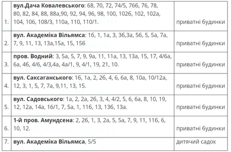 - вул. Академіка Вільямса: 1б, 1, 1а, 3, 3б,3а, 5б, 5, 5а, 7а, 7, 9, 11, 13, 13а,15а, 15, 15б;
