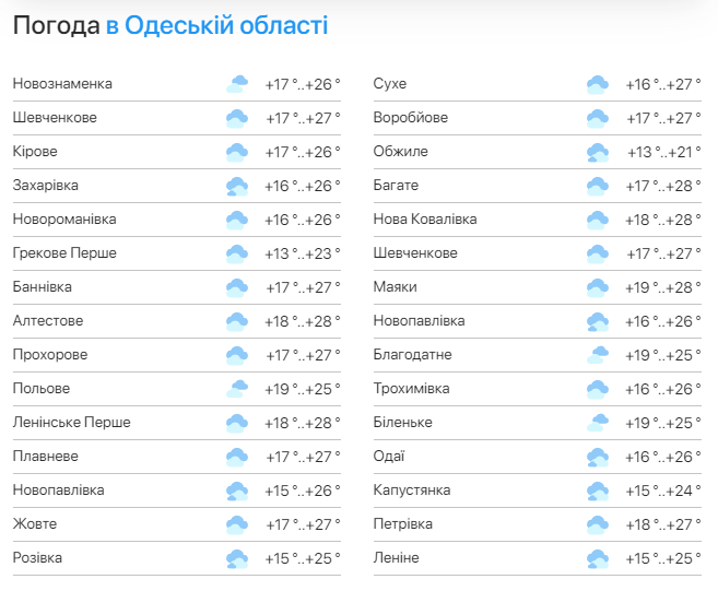 Сьогодні по всій Україні буде мінлива хмарність, проте без опадів. Середня температура повітря буде у межах 17-19 °С.