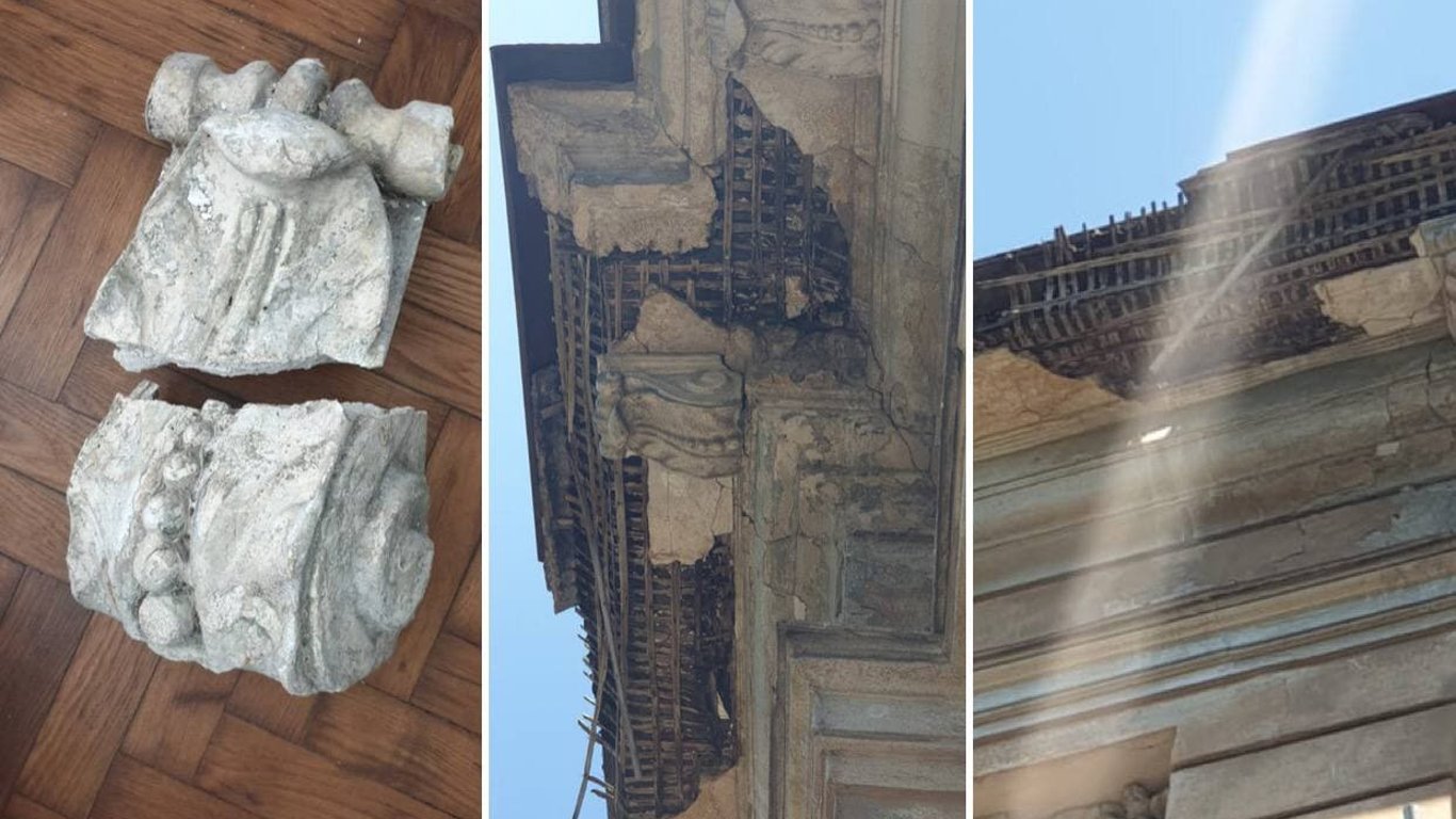 Наразі у будинку потрібен терміновий демонтаж і реставрація карниза, установка водостічного жолоба і заміна водостічної труби. А один з елементів навис і загрожує впасти в будь-яку хвилину.