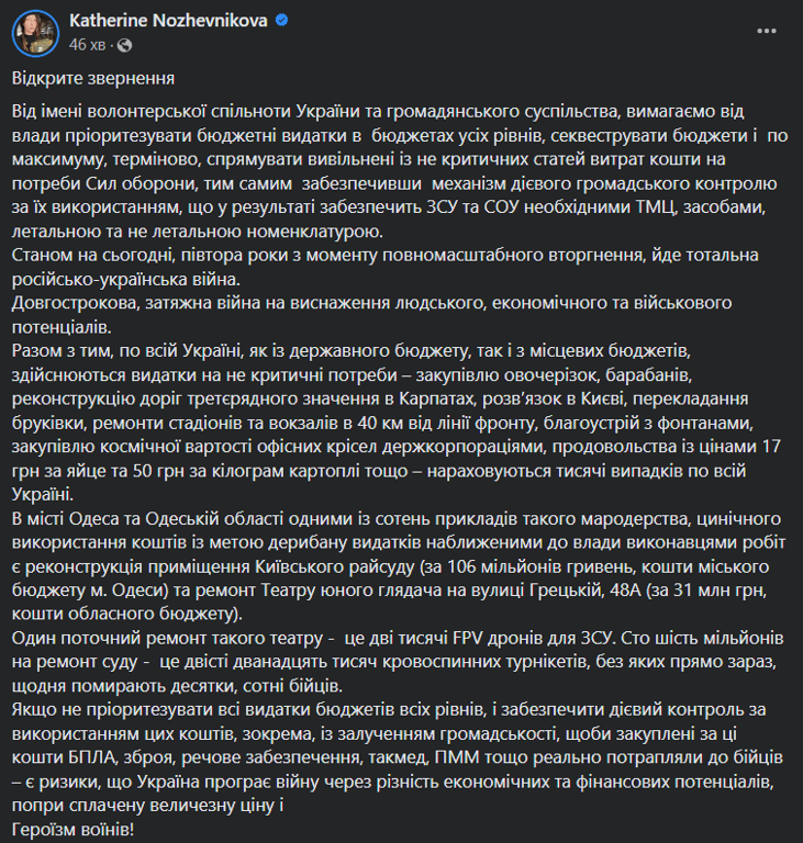 "У місті Одеса та Одеській області одними із сотень прикладів такого мародерства, цинічного використання коштів з метою дерибану витрат наближеними до влади виконавцями робіт реконструкція приміщення Київського райсуду (за 106 мільйонів гривень, кошти міського бюджету м. Одеси) та ремонт Театру юного глядача на вулиці Грецькій, 48А (за 31 млн грн, кошти обласного бюджету) Один поточний ремонт такого театру — це дві тисячі FPV дронів для ЗСУ — сто шість мільйонів на ремонт суду — це двісті дванадцять тисяч кровоспинних турнікетів, без яких прямо зараз, щодня помирають десятки, сотні бійців", — наголошується у зверненні.