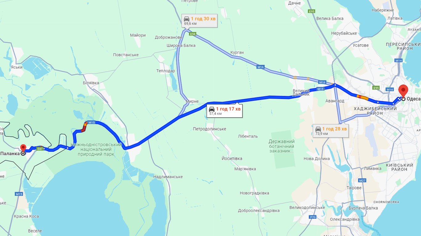 Наразі у бік Паланки є великий затор на виїзді з міста. Також скупчення автотранспорту спостерігається й перед КПП, що розташований поряд з Нижньодністровським національним природним парком. Там черга сягає близько трьох кілометрів. Ця ділянка на картах позначена червоним кольором.