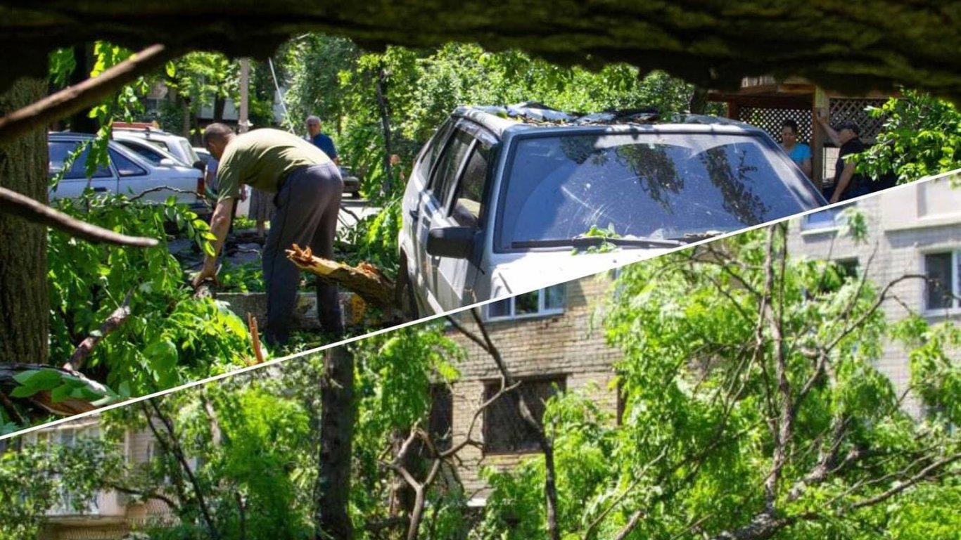 Дерево, яке вирвало з корінням, впало на автомобіль, припаркований у дворі. Під його вагою завалився стовп та вхід у парадну. Дерево перекрило собою також пішохідну зону.