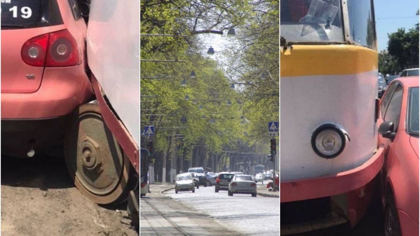 Неприємна несподіванка: в Одесі трамвай зійшов з рейок прямо в припаркований автомобіль