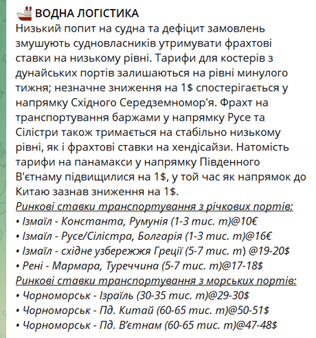 Аналітики у своєму останньому звіті зазначили, що тарифи для суден типу "костери" з дунайських портів залишаються на рівні минулого тижня. Спостерігається лише незначне зниження на один долар у напрямку Східного Середземномор'я. Фрахтові ставки на транспортування баржами у напрямку болгарських Русе та Сілістри, а також ставки на "хендісайзи", зберігаються на стабільно низькому рівні.