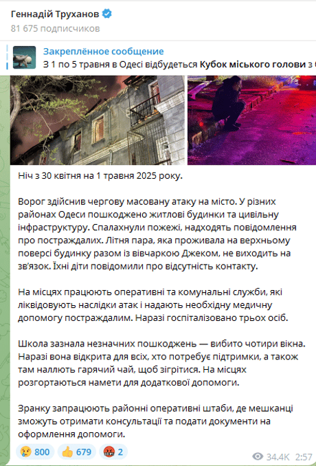 Нагадаємо, уночі 1 травня Одеса зазнала дронового удару. Спалахнули пожежі. Зазнала пошкоджень цивільна інфраструктура.