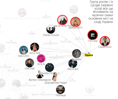 Зокрема, в Одесі до списку п'ятнадцяти найпопулярніших виконавців потрапили переважно репери — казахстанський російськомовний Скриптоніт, росіяни Гіо Піка (автор пісень на кримінальну тематику) та Miyagi & Andy Panda. Також у фаворитах російська поп-співачка українського походження Анна Асті.