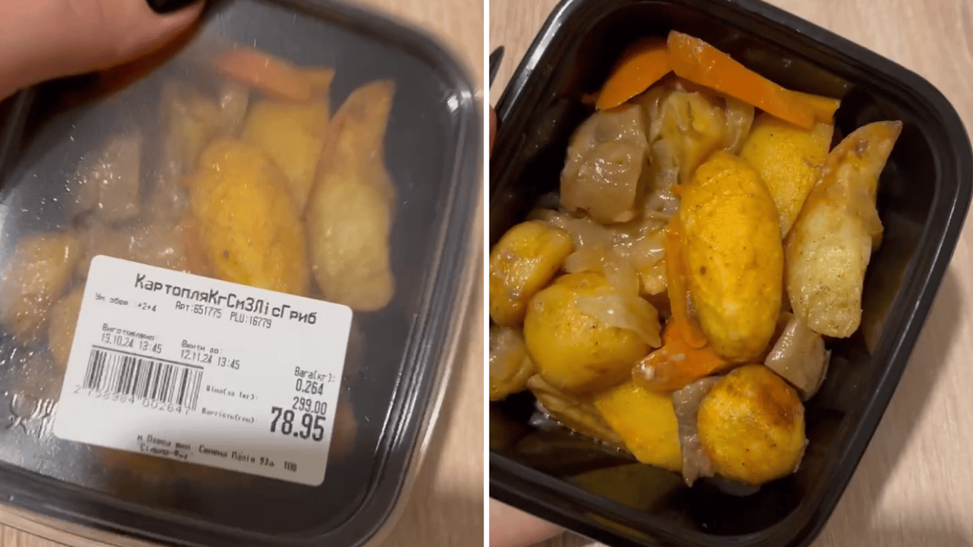 "За 264 грами заплатила 78 гривень 95 копійок. Картопелька з грибами смачний має вигляд, але зіпсована", — каже жінка.