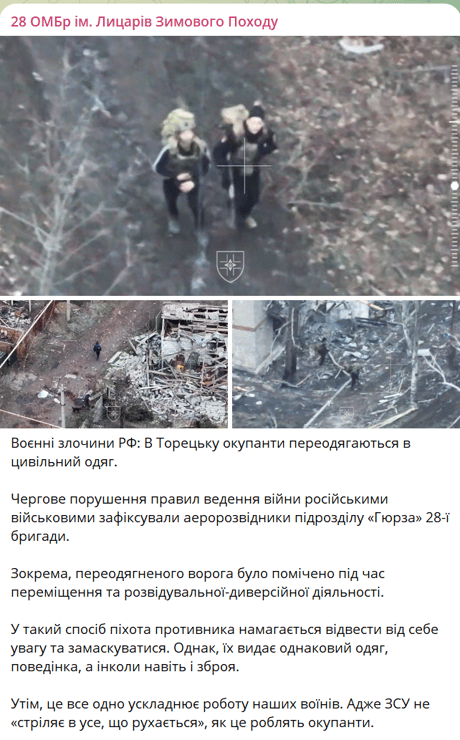 За словами військових, аеророзвідка підрозділу "Гюрза" 28-ї окремої механізованої бригади імені Лицарів Зимового Походу зафіксувала, як ворожа піхота використовує тактику маскування під цивільних, переодягаючись у звичайний одяг під час переміщення та виконання диверсійно-розвідувальної діяльності.