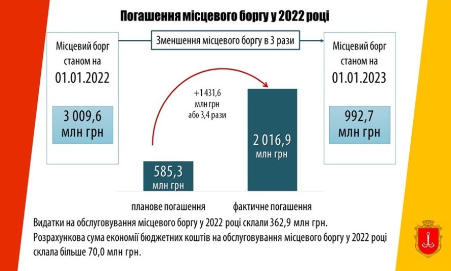 На початок 2022 року місцевий борг Одеської міськради становив понад 3 млрд гривень. Хоч в планах було повернути трохи понад 500 млн гривень за поточний рік, вдалося закрити борги на 2-3 роки вперед.