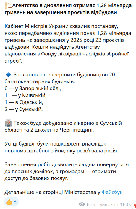 Кабінет Міністрів виділив понад 1,2 мільярда гривень на завершення проєктів відбудови в Україні. Частина цих коштів піде на відновлення Одещини. Загалом фінансування охопить 23 об'єкти по країні, у тому числі і з лікарнею та школами.