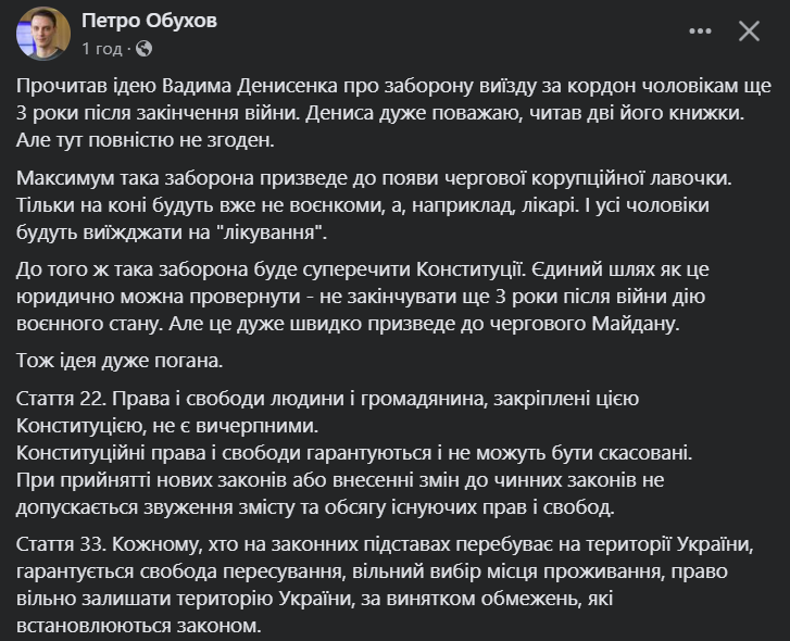 За його словами, така заборона може призвести до появи нової корупційної схеми для перетину кордону. Тільки "долю" вирішуватимуть не військкоми, а лікарі. Також він зазначив, що така заборона суперечитиме Конституції.