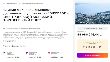 Регіональне відділення Фонду державного майна України оголосило черговий аукціон з продажу "Білгород-Дністровського морського торговельного порту". Аукціон відбудеться 16 вересня 2024 року зі стартовою ціною вдвічі зниженою порівняно з попереднім аукціоном, що не відбувся.