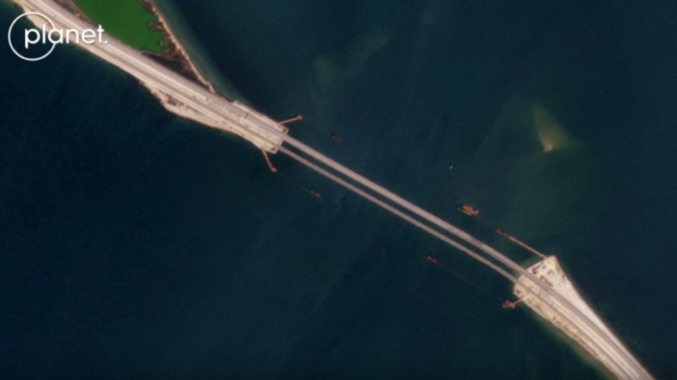 Зображення високої роздільної здатності показують два ряди загороджень із барж, які розміщені з обох сторін від судноплавного прольоту мосту з боку Чорного моря. Крім того, ближче до мосту помітні загородження, які складаються зі зв’язаних між собою тросами бочок.