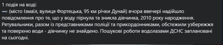 Вчора ввечері на вулиці Фортецькій у місті Ізмаїл, на 95-му кілометрі річки Дунай, зникла дівчинка-підліток. Відомо, що вона пішла купатися та зникла безвісти у воді.