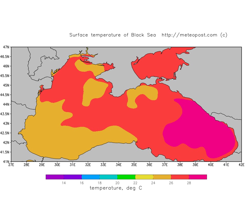 Наразі максимальна температура Чорного моря в територіальних водах України фіксується біля Стрілкового та Кирилівки. Вода там прогрілася до +27°С. В Одесі температура води сягає +25°С, а подекуди вона доходитиме до +26°С.