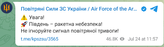 "Увага! Південь — ракетна небезпека! Не ігноруйте сигнал повітряної тривоги!", — йдеться в повідомленні.
