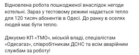 "Відновлена робота пошкодженої внаслідок негоди котельні. Зараз у тестовому режимі надається тепло для 120 тисяч абонентів в Одесі. До ранку в оселях людей має бути тепло", — написав він у Telegram.