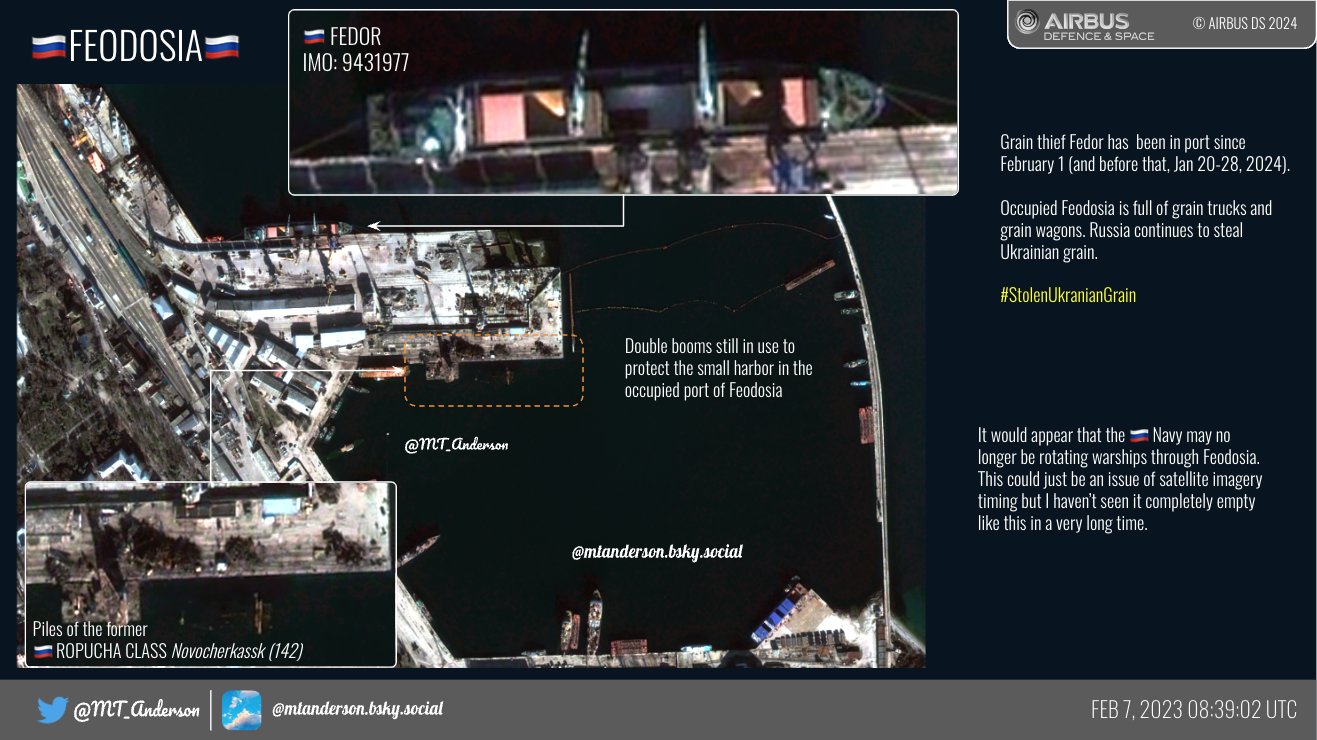 OSINT-дослідник MT Anderson опублікував свіжі супутникові знімки порту в Феодосії. З них зрозуміло, що Чорноморський флот Росії більше не тримає там свої кораблі. Наразі всі вони переведені в інші місця.