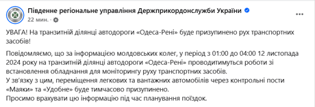 За інформацією молдовської сторони, у період з 01:00 до 04:00 проводитимуться роботи зі встановлення обладнання для моніторингу руху транспортних засобів.