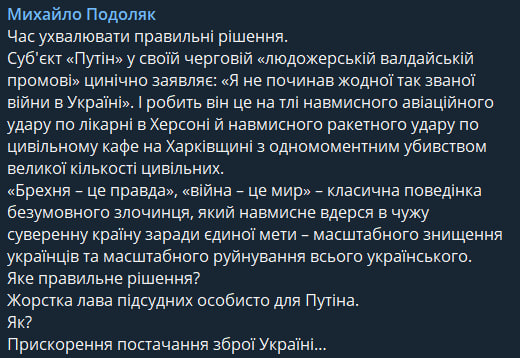Радник керівника ОП Михайло Подоляк також відреагував на виступ російського диктатора на "Валдаї":