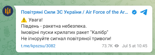 На півдні країни спостерігається ракетна небезпека. Ймовірно, ворог запустив "Калібри". Людей закликають не ігнорувати сигнали повітряної тривоги.