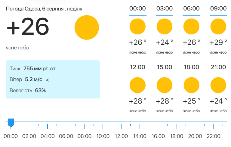 Сьогодні, 6 серпня, в Одесі весь день буде ясним, без хмар. Опадів не передбачається.