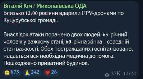 За інформацією Віталія Кіма, внаслідок дронової атаки було пошкоджено приватний будинок у Куцурубській громаді. Крім того, отримали поранення двоє місцевих мешканців: 60-річна жінка та 65-річний чоловік, який зараз у тяжкому стані. Обох постраждалих госпіталізували до лікарні на "кареті" швидкої допомоги.
