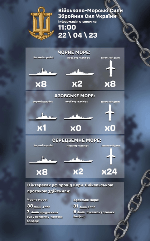 Перебуває один ворожий десантний корабель. Активності ракетоносіїв не зафіксовано.