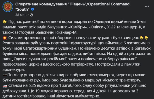"Решта завдали руйнувань портовій інфраструктурі, щонайменше 6 житловим, у тому числі багатоквартирним будинкам. Понівечено десятки автівок, в багатьох будівлях міста пошкоджені фасади та дахи, вибиті вікна. На одній з центральних площ Одеси влучанням російської ракети понівечено собор української православної церкви (московського патріархату). Постраждали 2 пам’ятки архітектури", — йдеться в повідомленні.