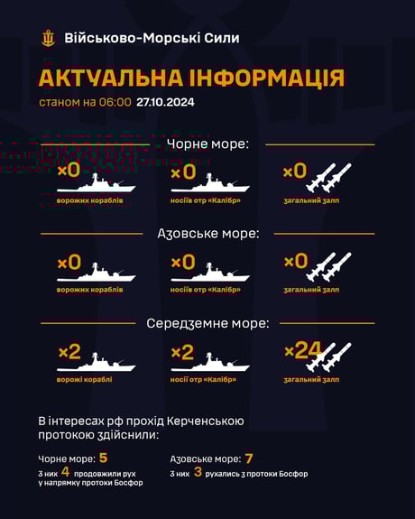 Станом ранок, 27 жовтня, в Чорному та Азовському морях відсутні російські військові кораблі, вони заведені в пункти базування. Однак у Середземному морі зафіксовані ворожі судна з ракетами "Калібр".