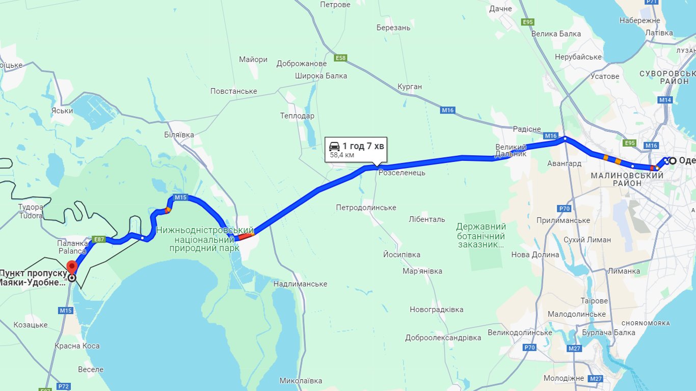 В сторону пункта пропуска "Паланка — Маяки — Удобное" есть пробка в районе села Маяки и КПП, которая размещается в пределах Нижнеднестровского национального природного парка. Эти участки на картах обозначены красным цветом. Путешествие в Паланку продлится сегодня чуть больше часа.