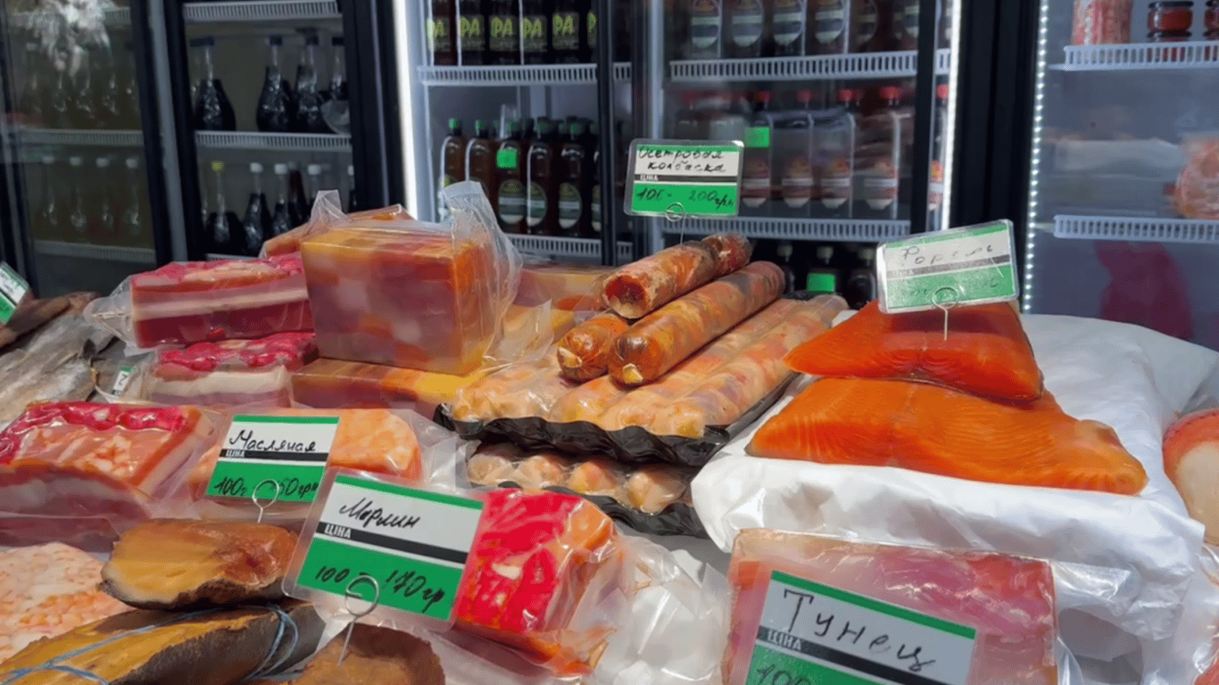 Среди самых дорогих товаров — это икра и морепродукты. На прилавках есть черная, красная и щучья икра, а также крабы и печень трески.
