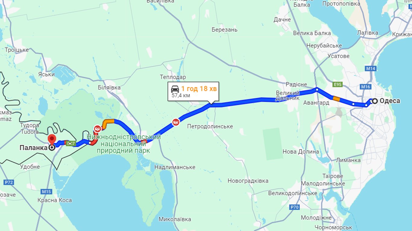 Сейчас в сторону пункта пропуска "Паланка — Маяки — Удобное" есть пробка на выезде из Одессы, а также большое скопление машин в пределах населенного пункта Маяки и Нижнеднестровского природного парка, где произошло ДТП. Эти участки на картах обозначены красным и оранжевым цветом. Путешествие в Паланку продлится сегодня 1 час 18 минут.