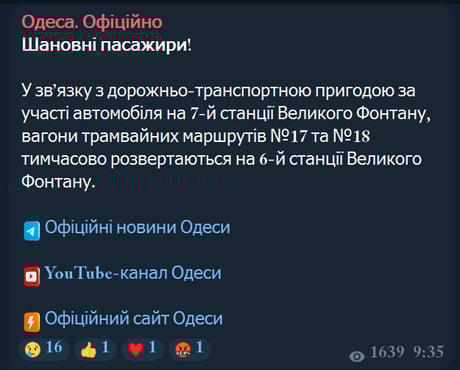 Из-за автомобильной аварии на 7-й станции Большого Фонтана вагоны трамвайных маршрутов №17 и №18 временно разворачиваются на 6-й станции Большого Фонтана, не доезжая до конечной остановки.